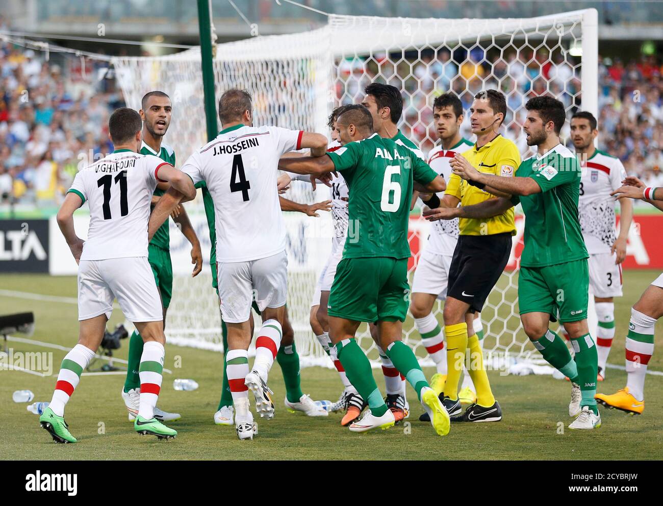 Iran And Iraq Players Scuffle Following A Challenge By Iraq S Marwan Hussein Al Ajeeli 2nd L On Iran S Goalkeeper Alireza Haghighi During Their Asian Cup Quarter Final Soccer Match At The Canberra Stadium In